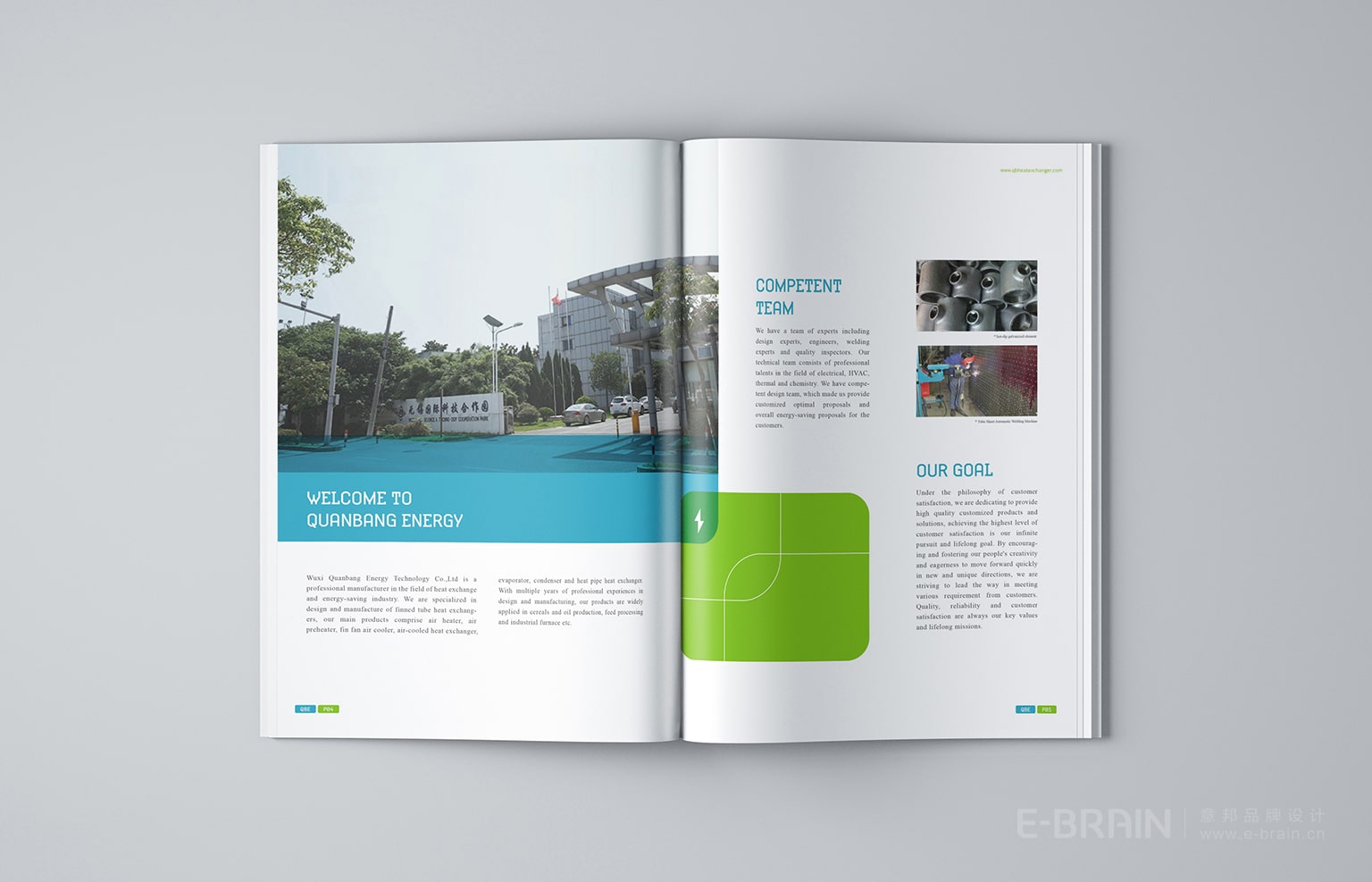无锡全邦能源科技有限公司是一家节能型科技企业,也是一家在换热器行业有着多年丰富设计和制造经验的科技公司。意邦设计公司在画册设计中注重产品信息的合理传达与分布,画册版面设计给人干净整洁的印象,传达出了全邦能源注重为客户提供优质的产品与服务的品牌理念。