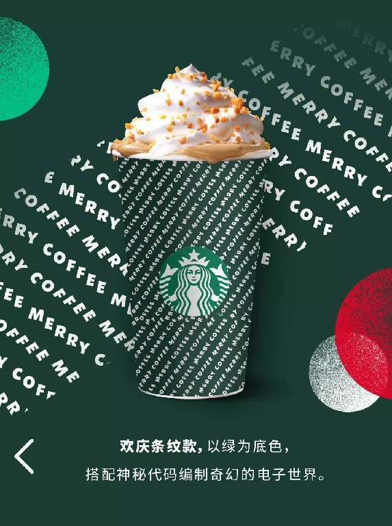 庆祝条纹款以深绿色为基调,杯身包裹着“MERRYCOFFEE”白色字样和倾斜重复的连续图案,中央点缀着星巴克标志,呈现出神秘代码的奇妙电子世界。简洁大方的设计充满现代感,给人以时尚感受。