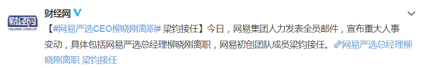10月28日,网易集团人力发表全员邮件,宣布重大人事变动,具体包括网易严选总经理柳晓刚离职,网易初创团队成员梁钧接任。