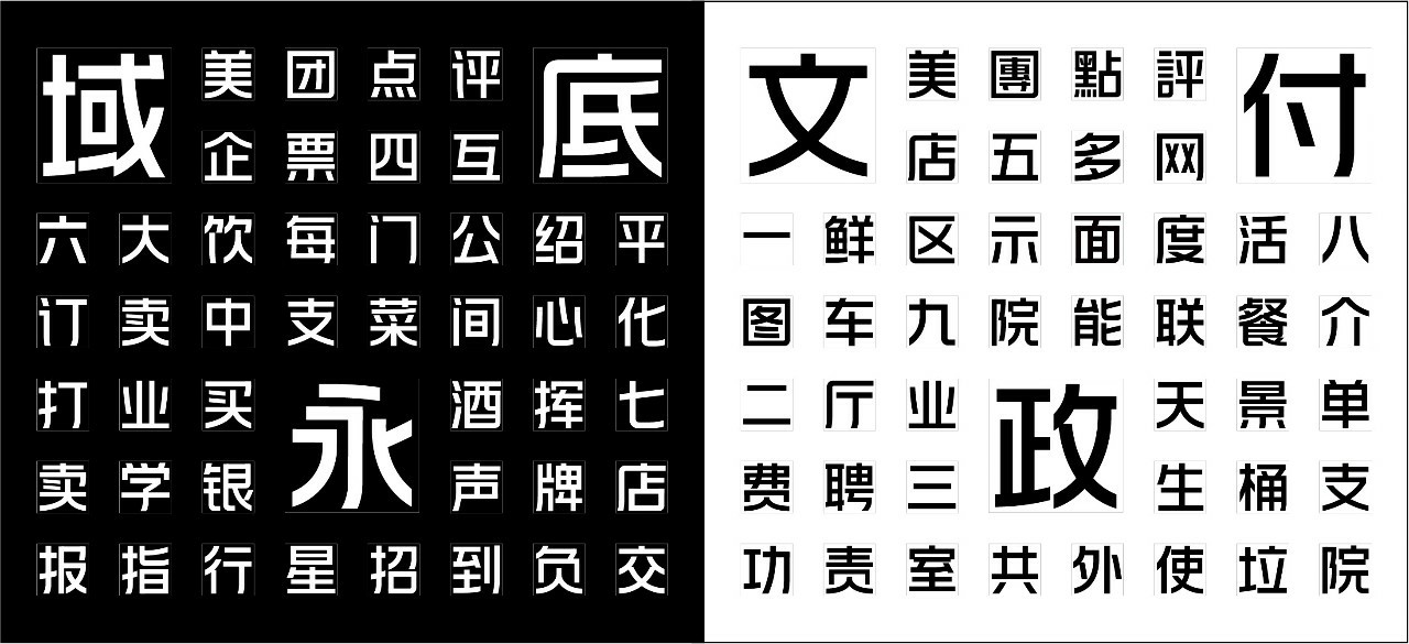 随着美团二字设计方案的确定,紧接着上市需要又产出了“美团点评”“美團點評”几个字。简单总结有以下两个特征: