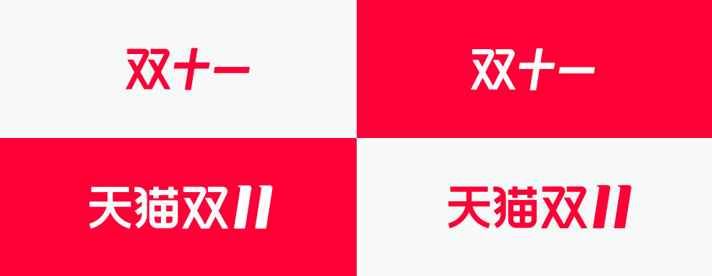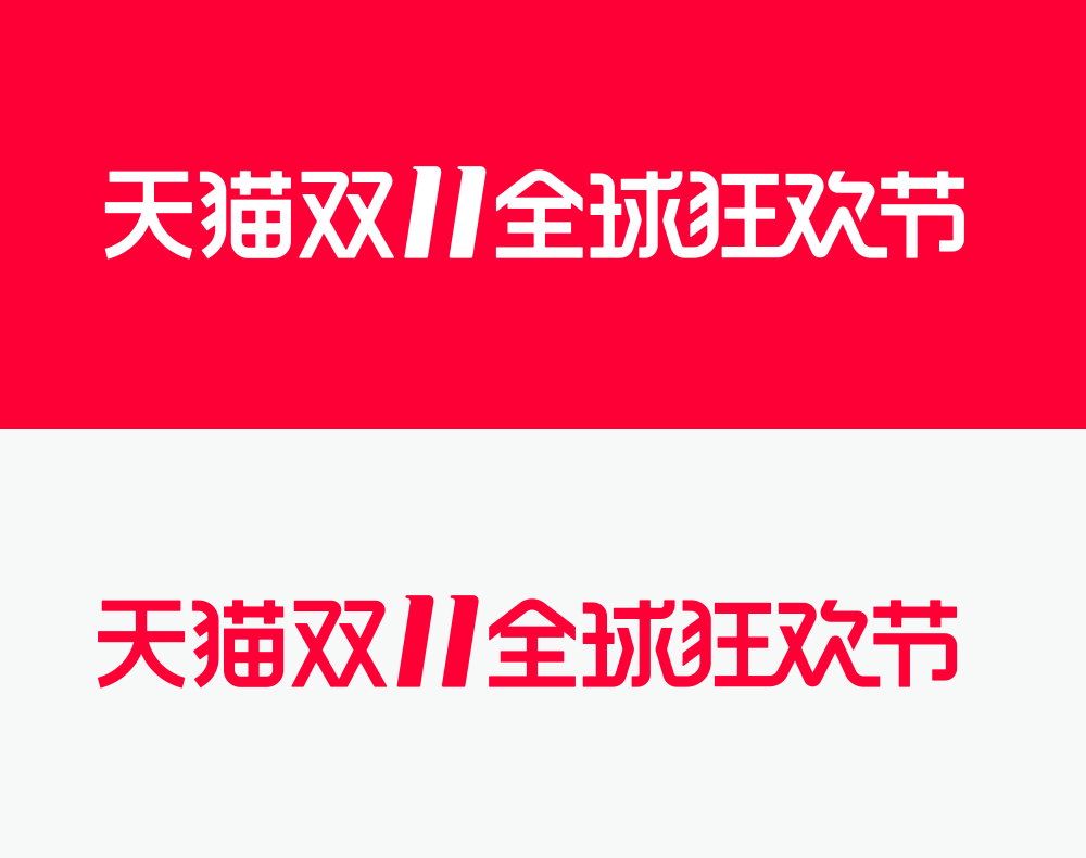 中文的字体也沿用了上一年的版式,今年的口号有“天猫双11来啦”、“双十一”、“天猫双11”以及“天猫双11全球狂欢节”。