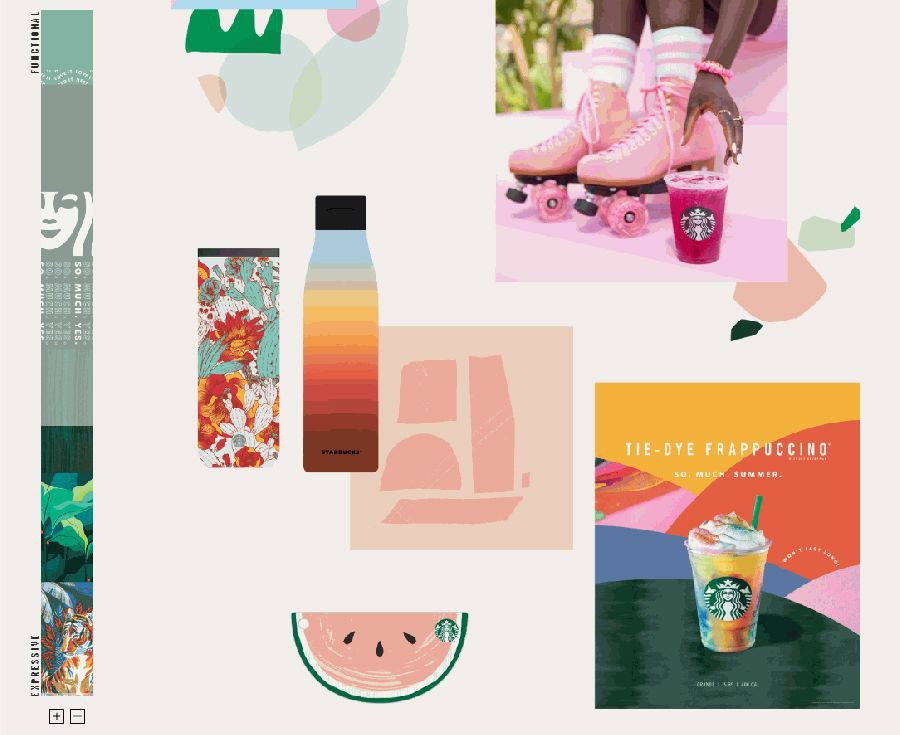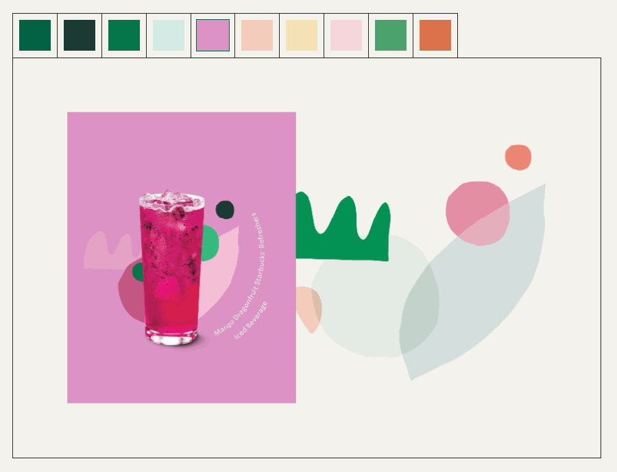每一季,团队从新推出的饮品中提取灵感,挑选出流行色调,接着便展开、延伸出一系列的视觉设计,然而,这些都得回归星巴克最具代表性的颜色——Starbucks Green (PANTONE 3425)。」