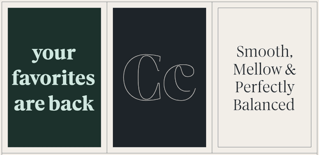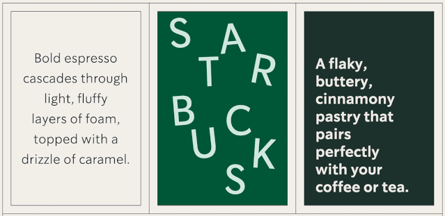 中规中矩的Sodo Sans 是星巴克运用最为广泛的字体,常见于文案内容;Lander 是三者中唯一的衬线字体,主要用于表达情绪感染力的情境中;而拥有俐落轮廓的Trade Gothic LT 则作为标题时使用。