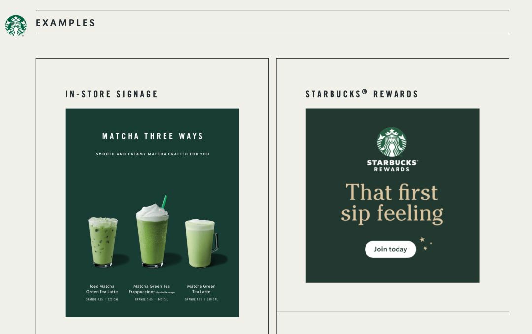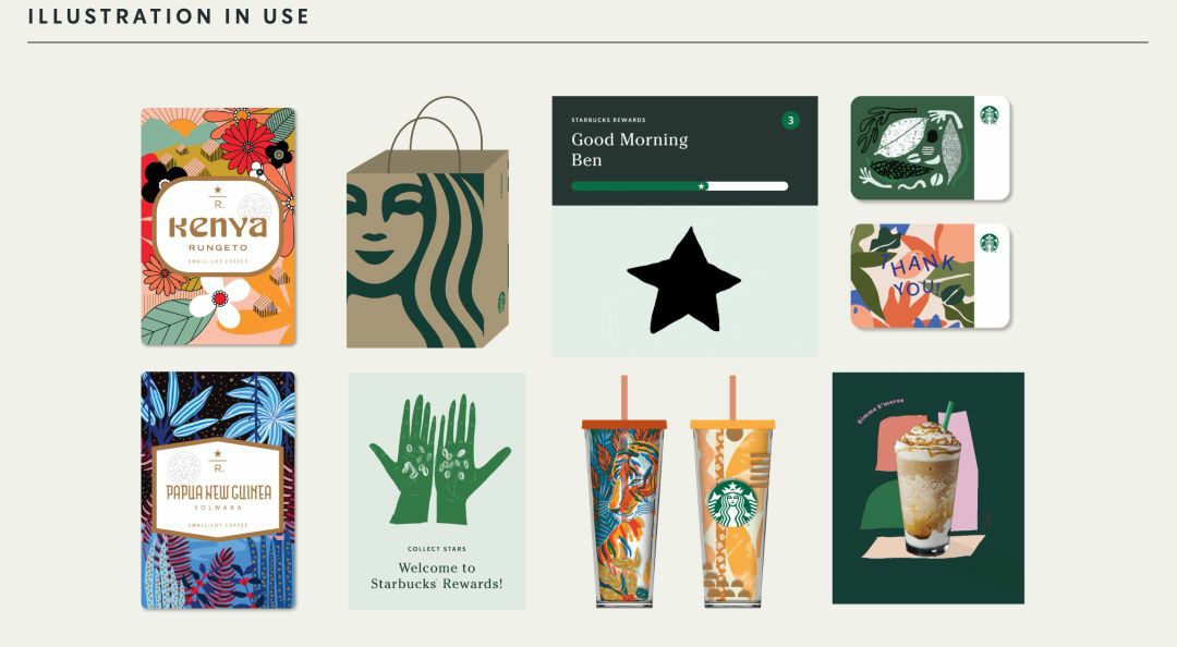 星巴克设计团队以绿色作为锚点,将视觉风格加以延伸,树立品牌鲜明印象。