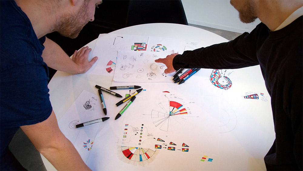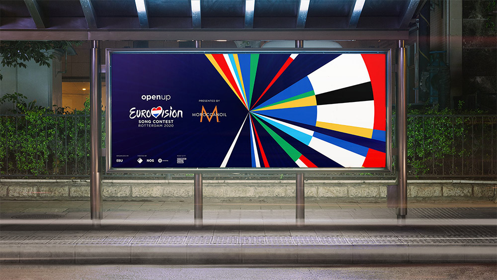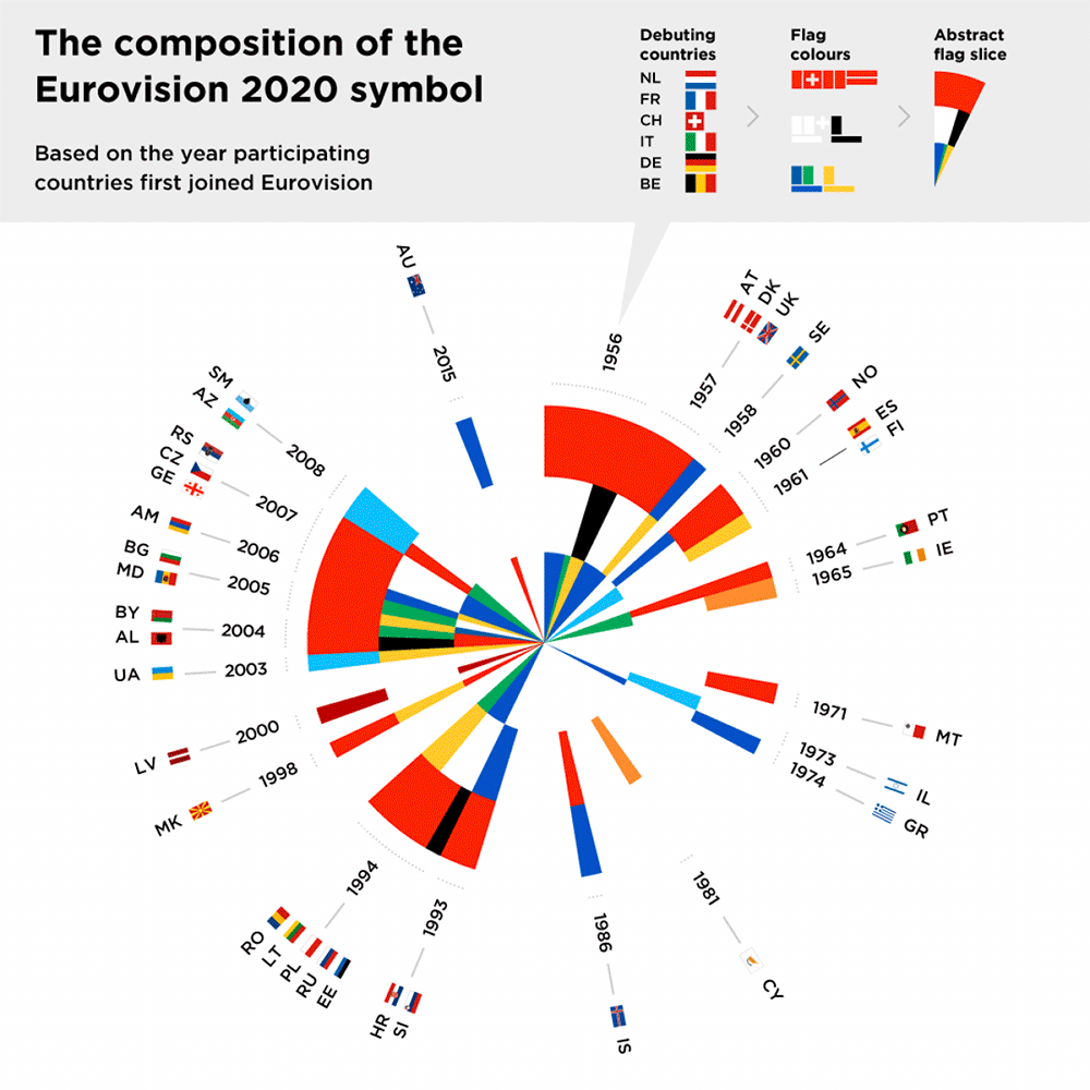 2019年11月28日,2020年第65届欧洲歌唱大赛主视觉形象正式发布。此次第65届欧歌赛的主题为“Open Up”。设计师使用 Processing 和 Illustrator 软件按照41个参赛国自1956年以来每届的参赛顺序,将每个国家的国旗颜色提取出来,顺时针排列成一个圆形数据图表,展示出歌唱大赛庞大的历史数据。同时图形整体又像抽象的彩色的风车,直接展现了「风车之国」的特色的景色。