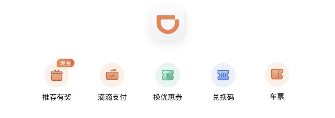 而滴滴的图标设计则是通过提炼 Logo 的图形特征(上圆下方),形成新的图形。滴滴品牌基因塑造一直是比较出彩的,最早版本的图标设计就很注重这方面,下面是我截的最新版本图。