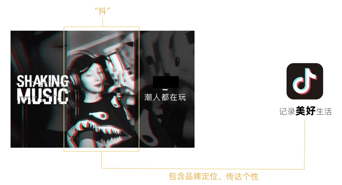 相信大家一眼就能看出,那你是通过什么元素辨别出来的呢?我们拆解一下(如下图),首先图形里包括了抖音的“抖”的设计风格,其实这种撞色风格实际上并不是抖音的专利,但自从抖音以此风格作为主要设计风格,大家便形成了这样的品牌印象,其次我们看一下人物形象——一个年轻又好看的女孩,而人物形象的选择则代表了其定位,这就很好的传达抖音的品牌个性。