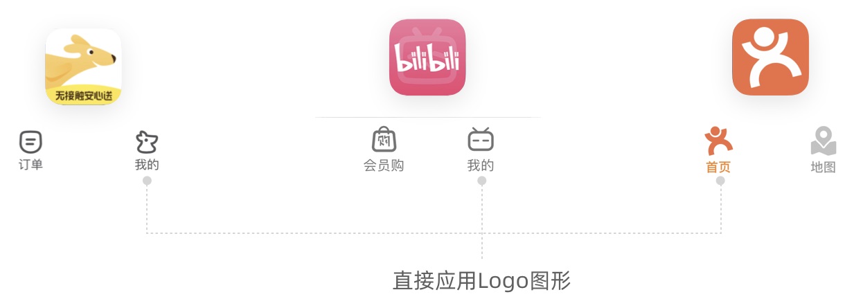 提炼品牌基因最常见的手法是从 LOGO 中提取图形,图形可以直接将 logo 应用在界面上,也可以简化 logo 特征形成新的图形。比如,美团,B 站等直接将 LOGO 应用在图标设计上。