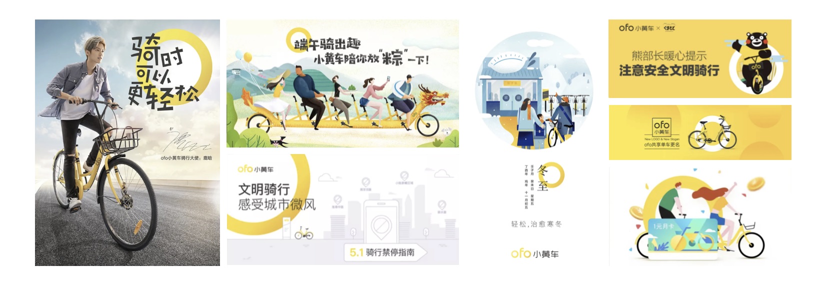 我们再来看一下 ofo 的广告图,官方海报通过当时最受年轻人喜欢的爱豆之一作为品牌代言人,其充满活力的骑着小黄车;整体物料的设计页面元素透气,轻盈;这正是 ofo 想要传达给用户的直观感受——轻松、活力。